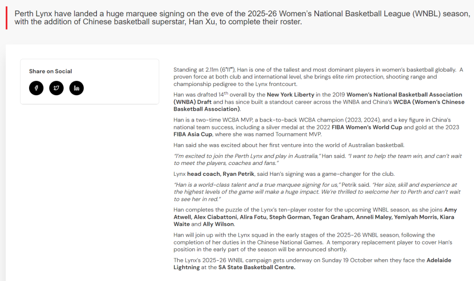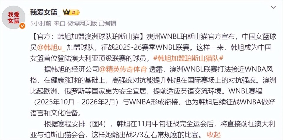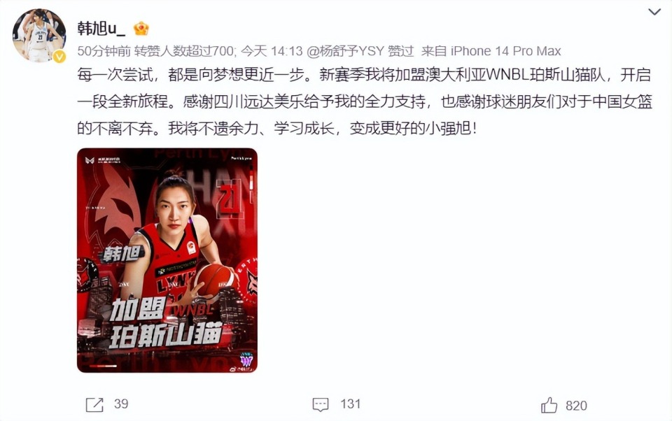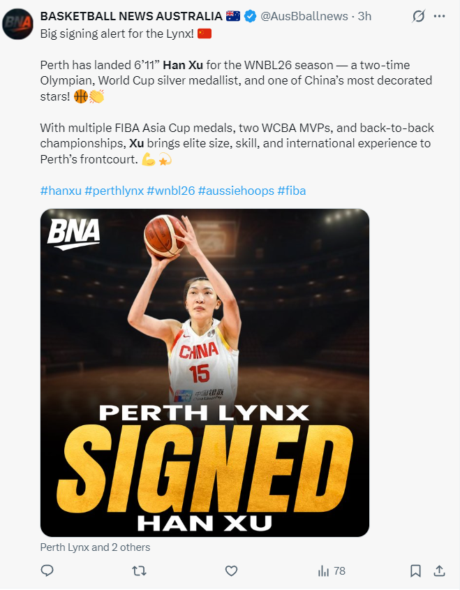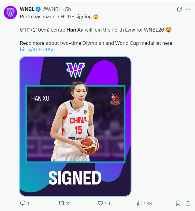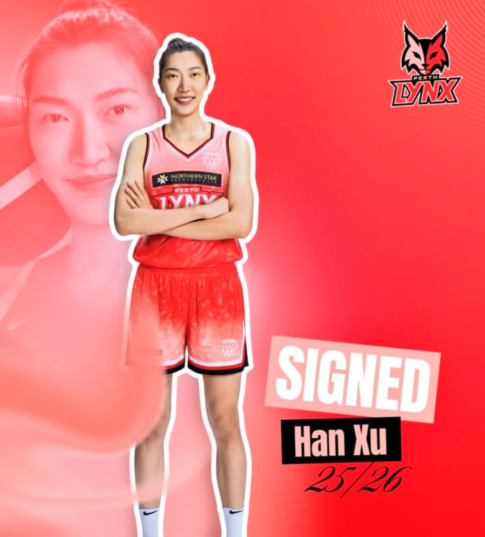 WNBL官方也欢迎韩旭加盟,WNBL写道:珀斯山猫签下了超级巨星,太令人震惊了,身高6尺11寸(2.10米)的中锋将加盟山猫征战WNBL。